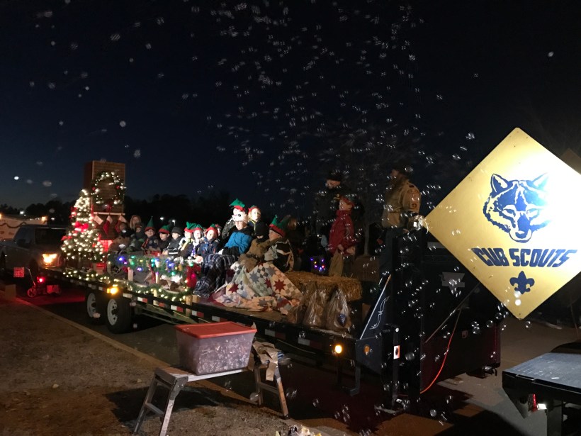The second addition this year was elf hats for all the scouts. Between the “snow” and the “elves”, it looked like Santa’s workshop! We heard lots of positive comments from the sidelines as we walked the route. When we finished the route we were motioned to join the other entrants who had won an award and were pleased to receive the Mayor’s Award (Large Float) for the third year running.